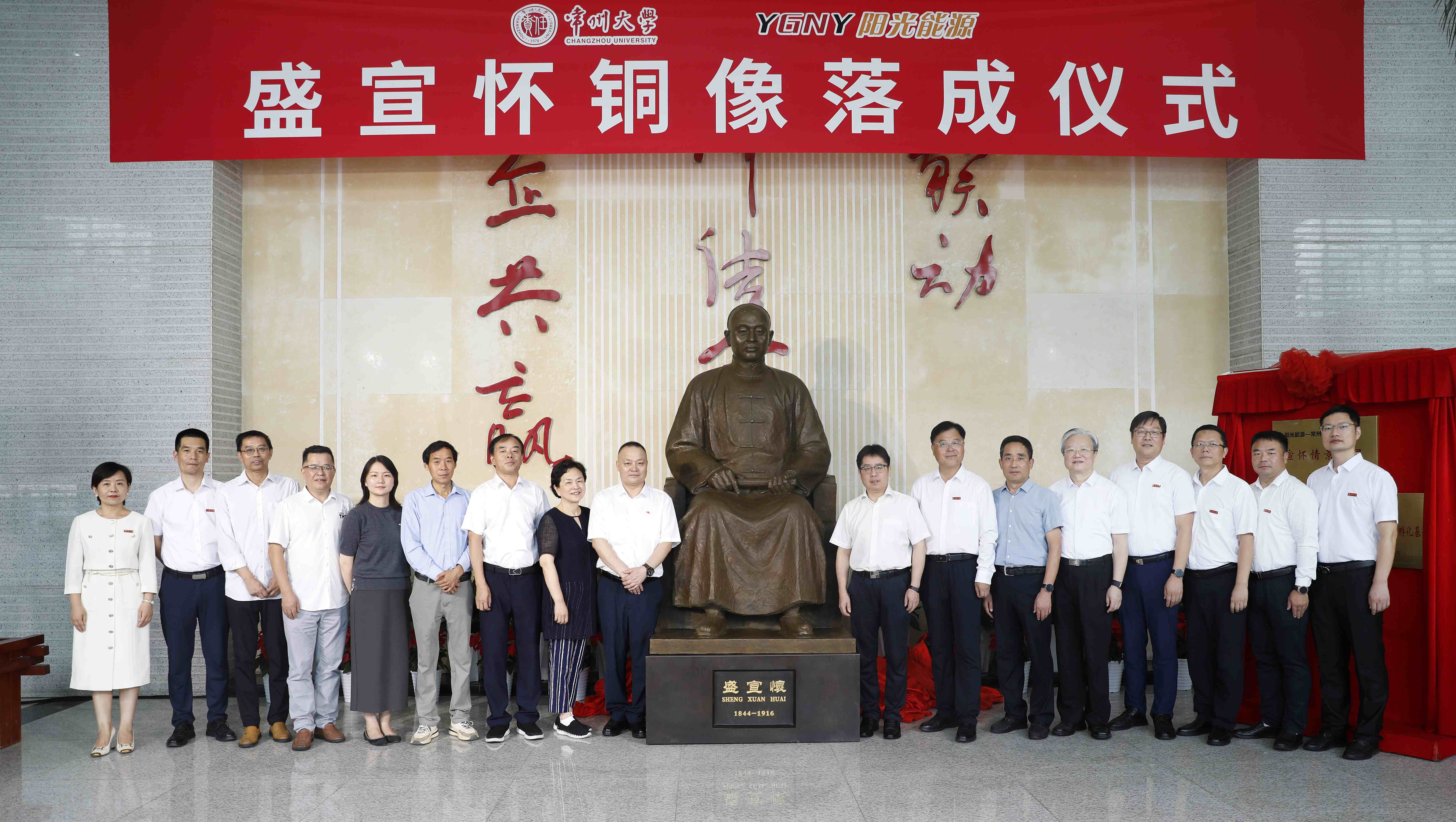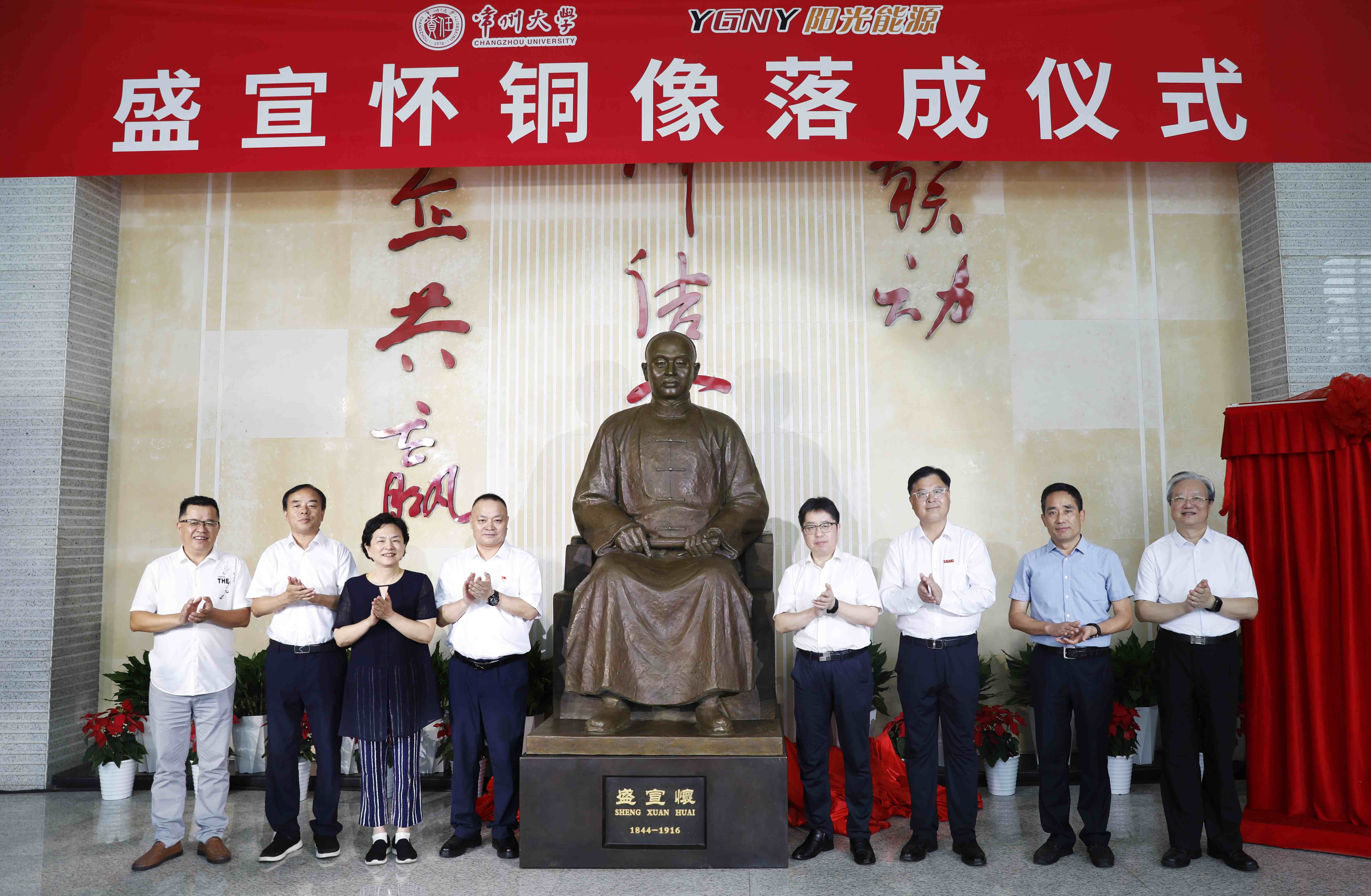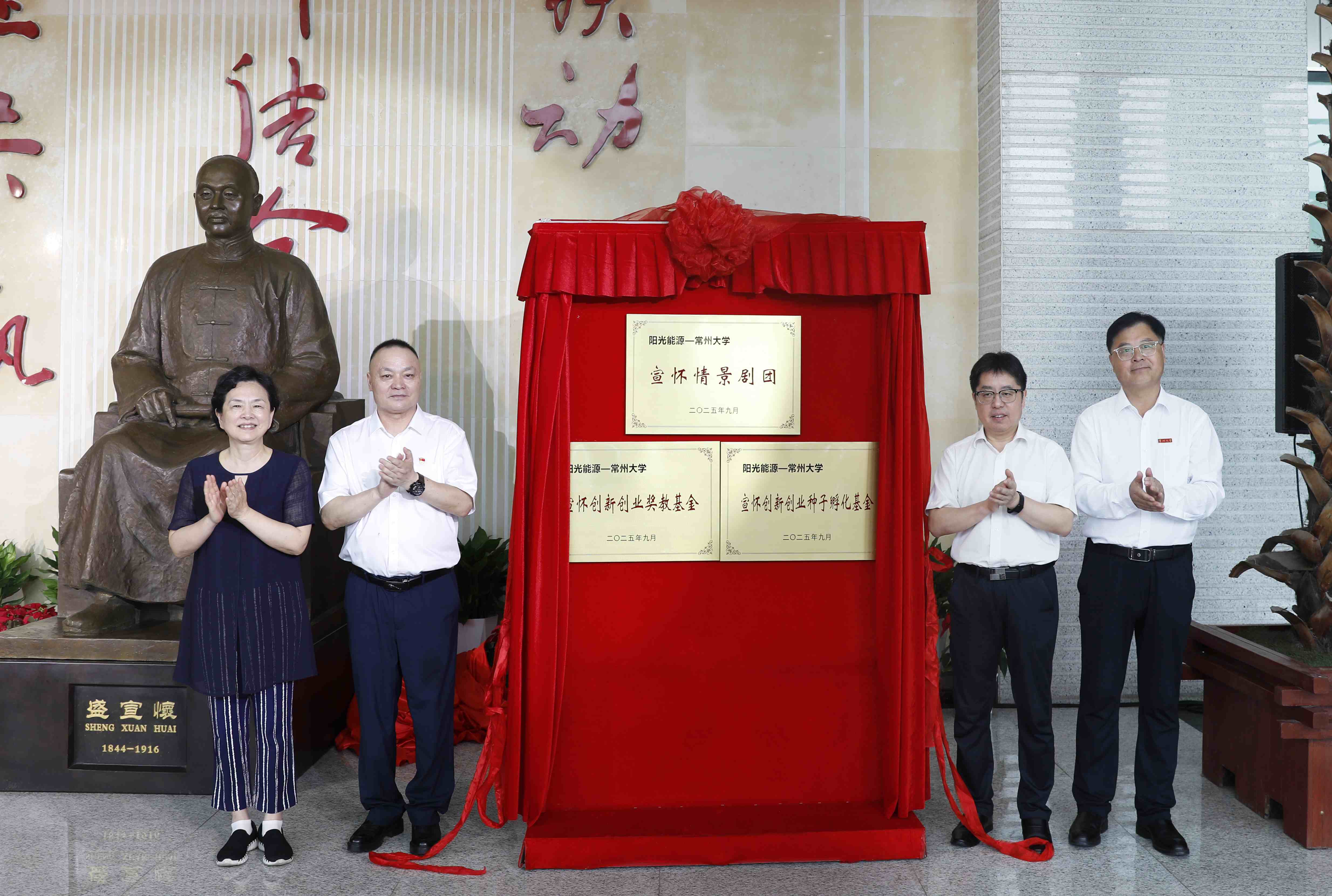 9月25日上午,盛宣怀铜像落成仪式在常州市国家大学科技园举行。常州市人民政府副市长潘冬铃,盛氏后裔、阳光能源集团(香港)有限公司董事长盛延生,常州市政协原副主席、常州市盛宣怀研究会原会长、常州大学宣怀产业创新学院战略发展顾问委员会主任张跃,常州科教城党工委委员、管委会副主任庄三舵,常州市政协二级巡视员、常州市盛宣怀研究会原常务副会长、常州大学宣怀产业创新学院战略发展顾问陈满林,阳光能源集团(香港)有限公司副总经理蒋春涛,上海交通大学常州校友会会长戴云徽,安徽省级雕塑工匠名师、雕塑家王新文,常州大学党委常委、副校长李忠玉,党委常委、宣传部部长薛冰出席活动。常州市企业家代表,常州大学教育发展基金会、团委、音乐与影视学院、创新创业学院、资产经营管理有限公司负责人参加活动。薛冰主持仪式。