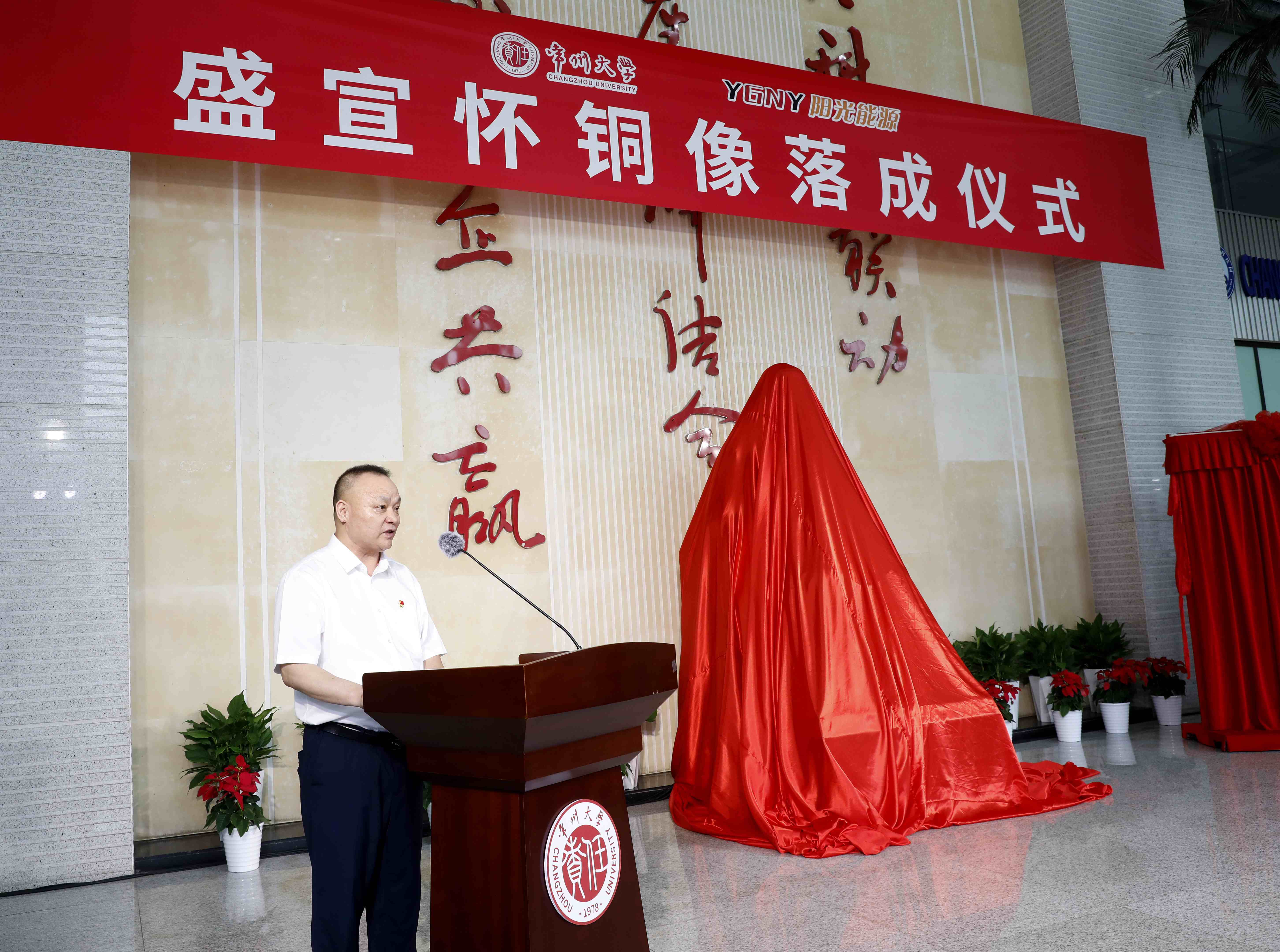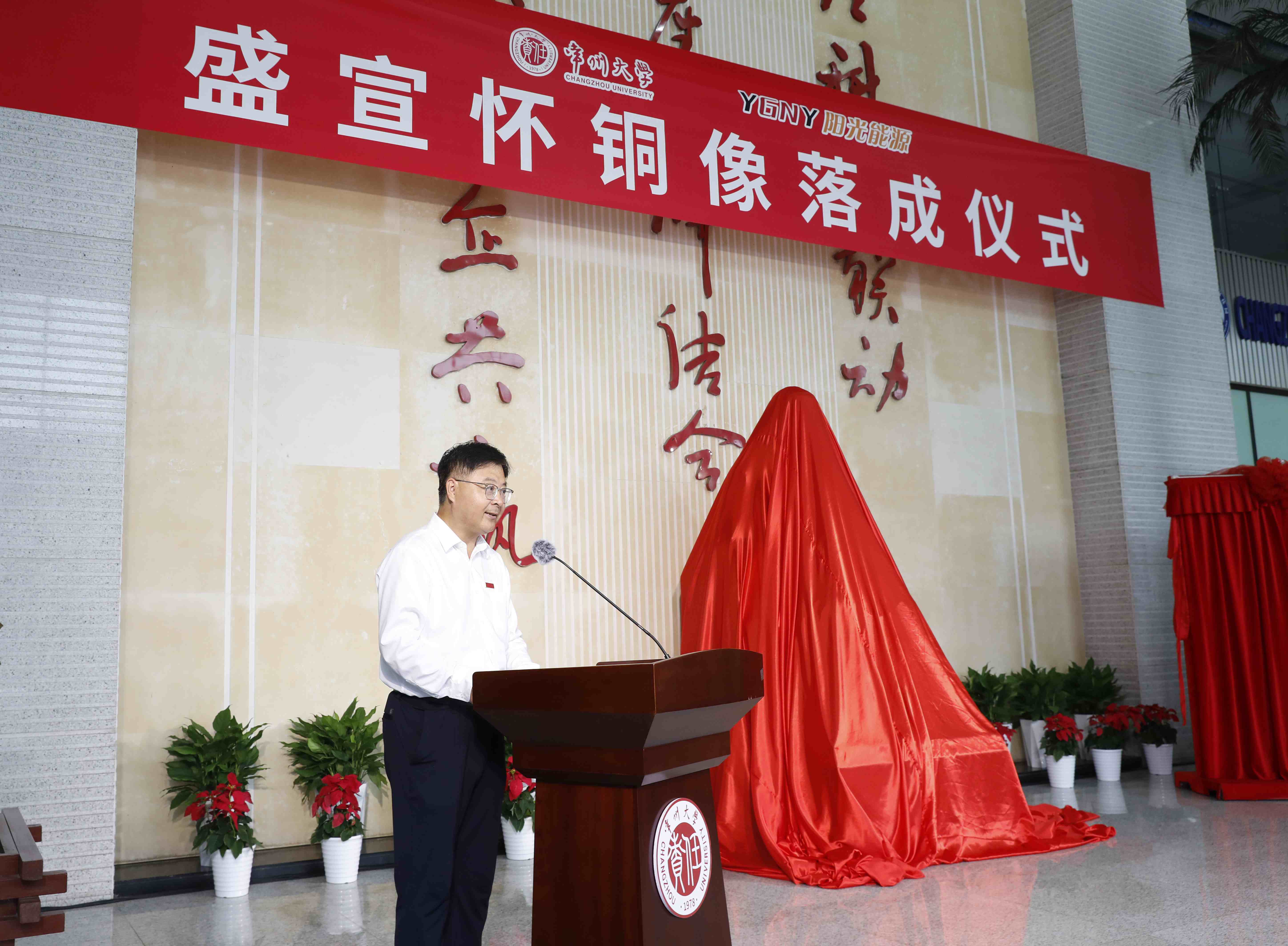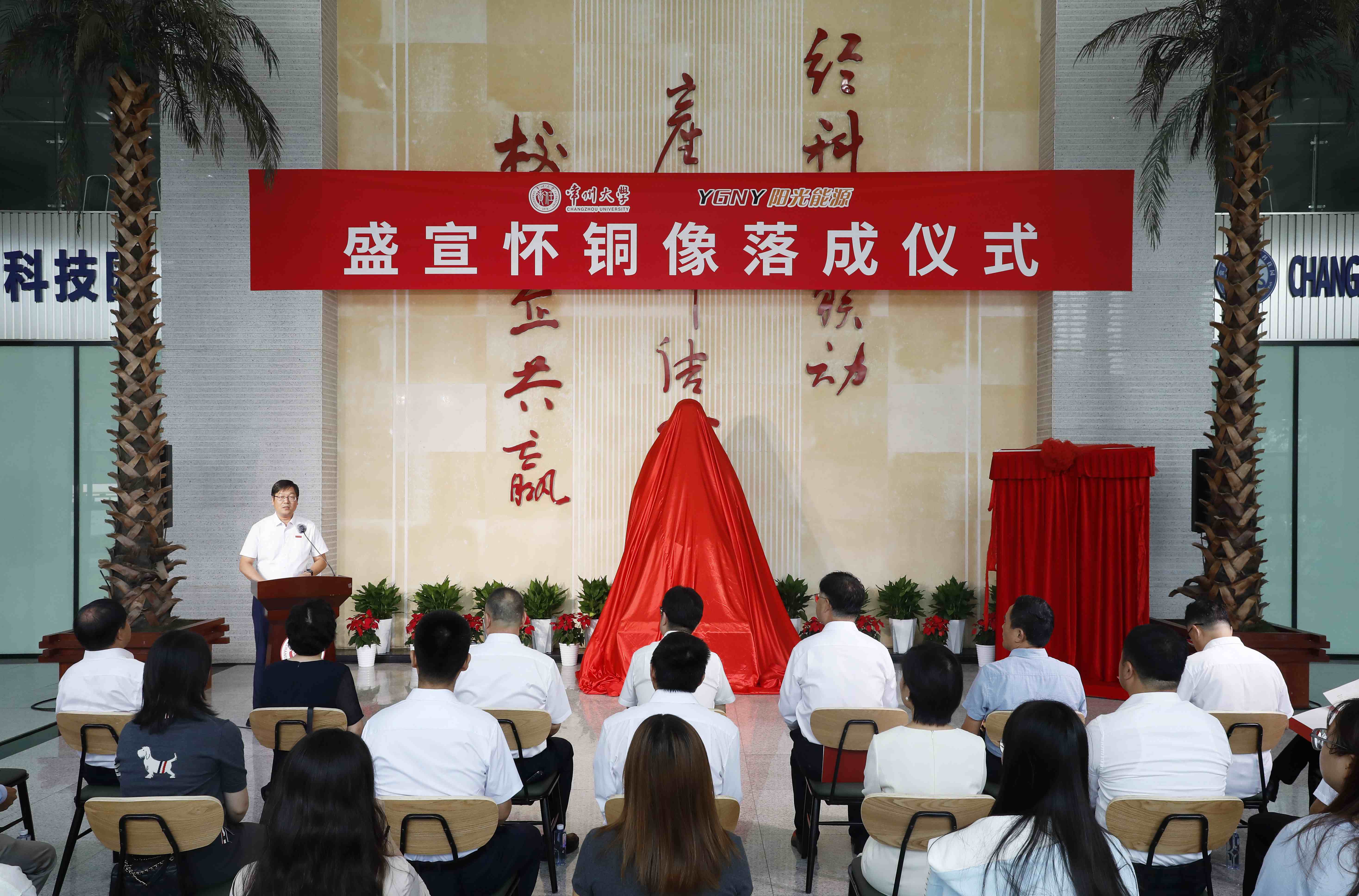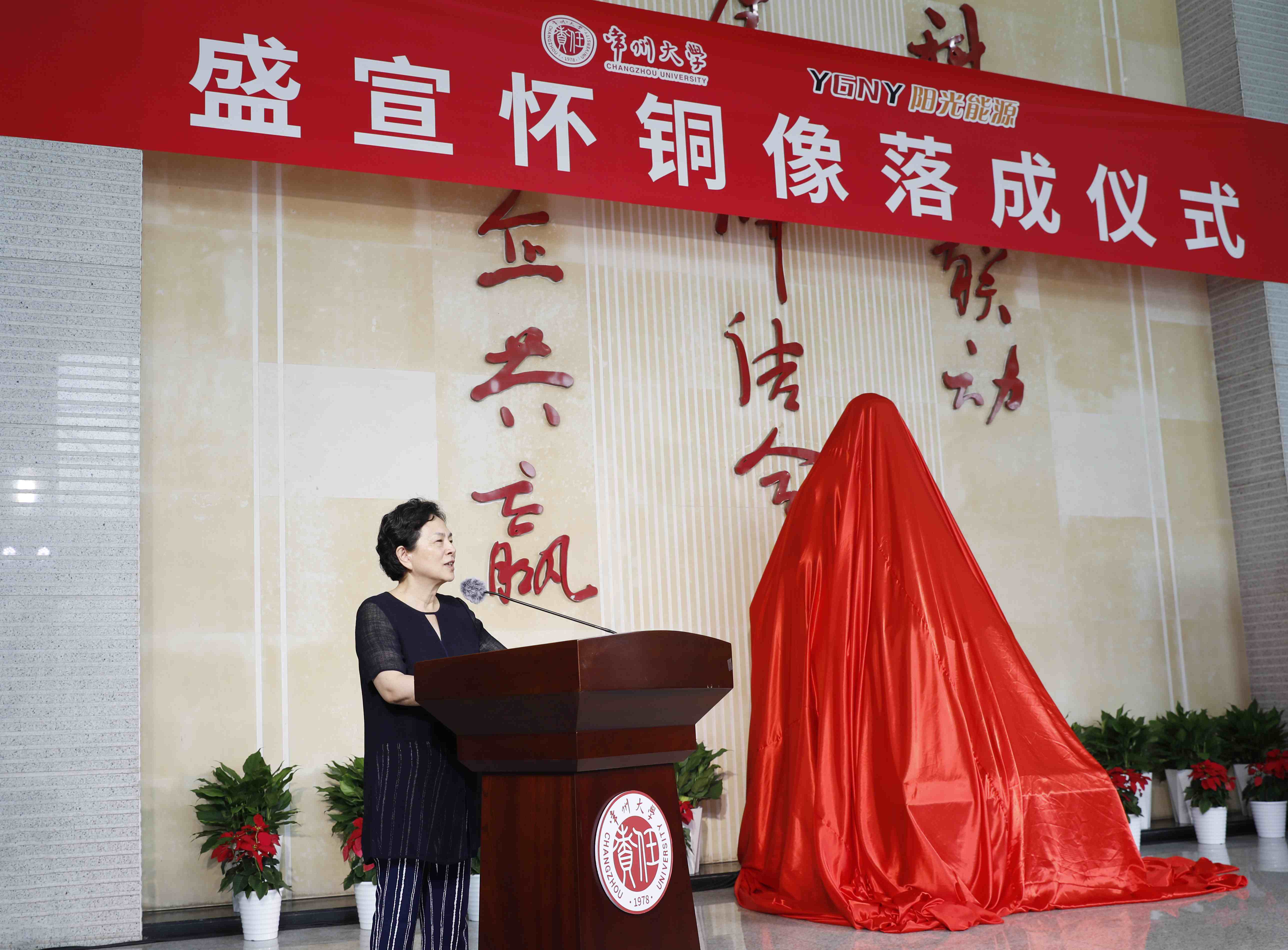 9月25日上午,盛宣怀铜像落成仪式在常州市国家大学科技园举行。常州市人民政府副市长潘冬铃,盛氏后裔、阳光能源集团(香港)有限公司董事长盛延生,常州市政协原副主席、常州市盛宣怀研究会原会长、常州大学宣怀产业创新学院战略发展顾问委员会主任张跃,常州科教城党工委委员、管委会副主任庄三舵,常州市政协二级巡视员、常州市盛宣怀研究会原常务副会长、常州大学宣怀产业创新学院战略发展顾问陈满林,阳光能源集团(香港)有限公司副总经理蒋春涛,上海交通大学常州校友会会长戴云徽,安徽省级雕塑工匠名师、雕塑家王新文,常州大学党委常委、副校长李忠玉,党委常委、宣传部部长薛冰出席活动。常州市企业家代表,常州大学教育发展基金会、团委、音乐与影视学院、创新创业学院、资产经营管理有限公司负责人参加活动。薛冰主持仪式。